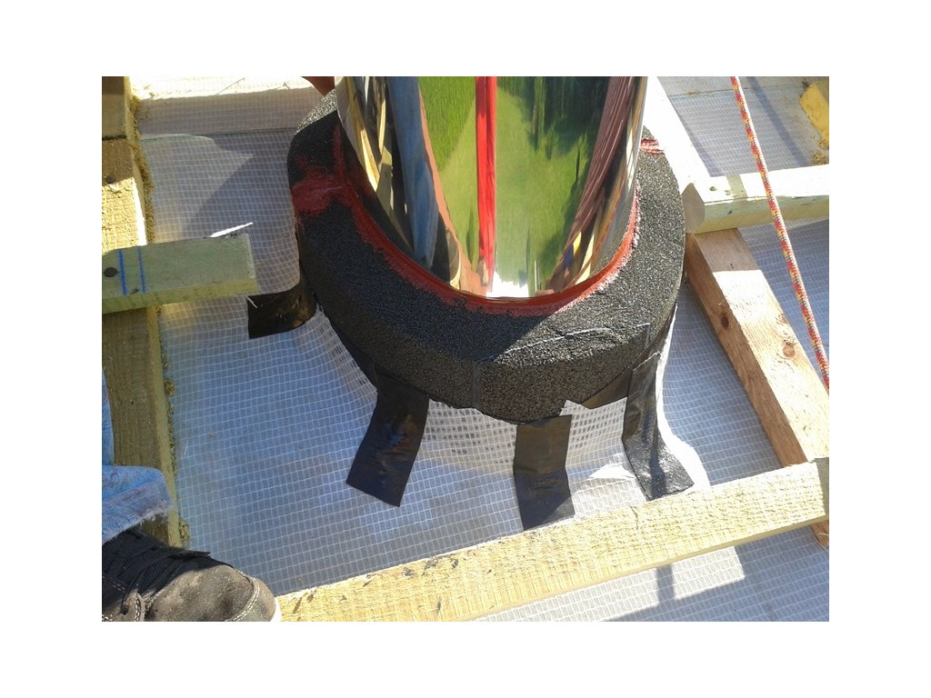 Vlastní prostup lze velmi jednoduše seříznout přesně dle potřeby v místě prostupu, je tedy vhodný i pro prostupy šikmými střešními konstrukcemi.